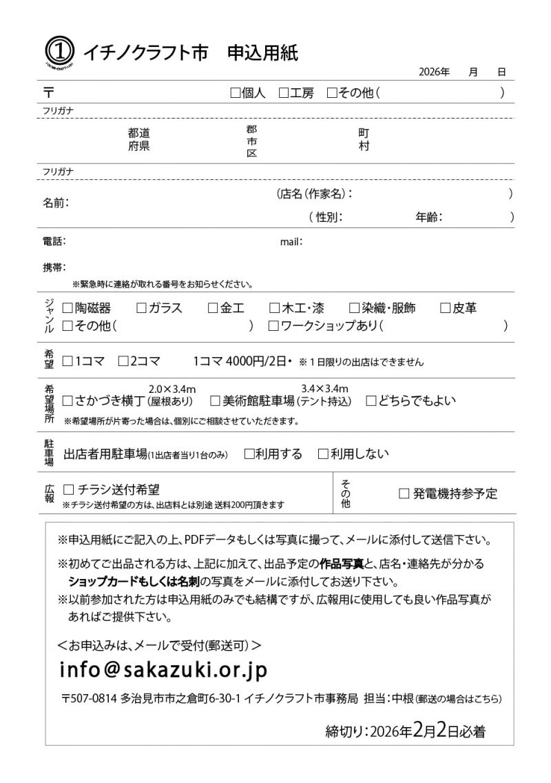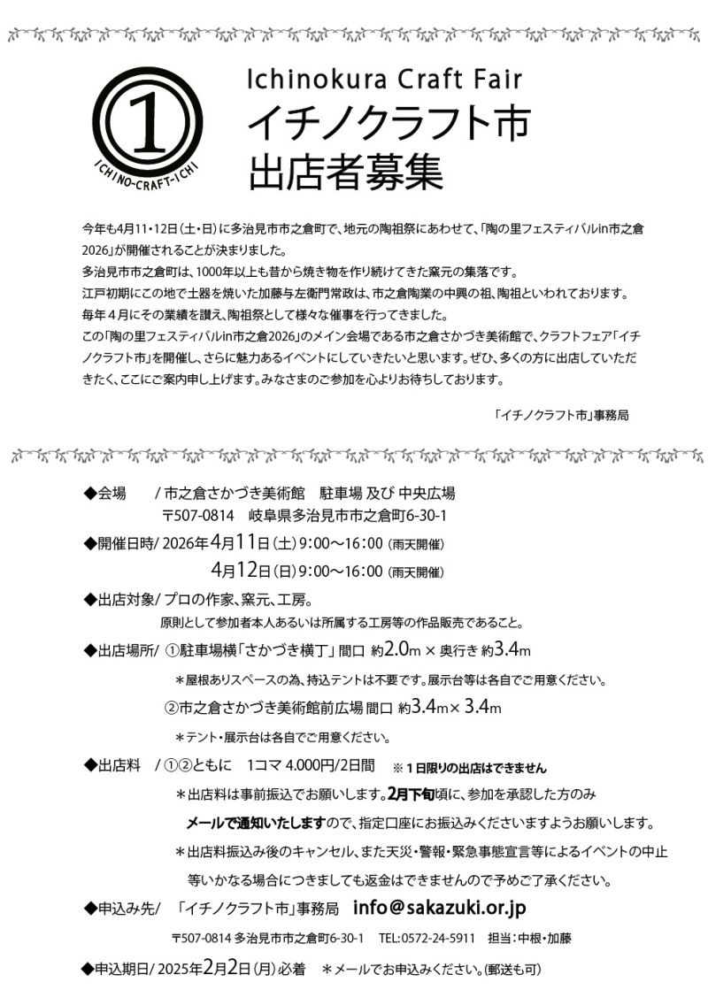 市之倉さかづき美術館内 「イチノクラフト市事務局」 メールアドレス: info@sakazuki.or.jp