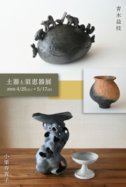 地元東濃で制作されている陶芸家 青木益枝さんと小栗寿賀子さんの二人展です。お二人の体を通じて土からうまれ出てきたカタチが、火焔に委ねられ、作品となります。野焼きや窖窯で焼かれた土器や須恵器。陶芸の原点を感じさせてくれるオブジェやうつわたちを、この機会に是非ご高覧ください。